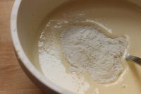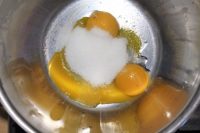 Mettiamo i tuorli in un contenitore insieme allo zucchero e iniziamo a sbatterli con una frusta da cucina. Cosi come lamido di frumento rende la torta margherita soffice e morbida. Sembra quasi di mangiare una nuvola.